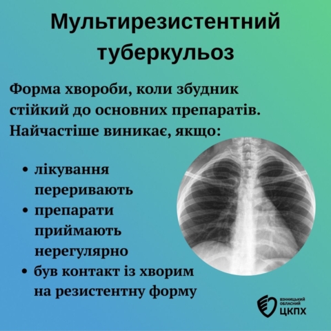 Мультирезистентний туберкульоз (МР ТБ) – це форма туберкульозу, що стійка щонайменше до двох найбільш ефективних протитуберкульозних препаратів – ізоніазиду та рифампіцину. Це означає, що ці антибіотики не будуть ефективно діяти на збудник хвороби.
