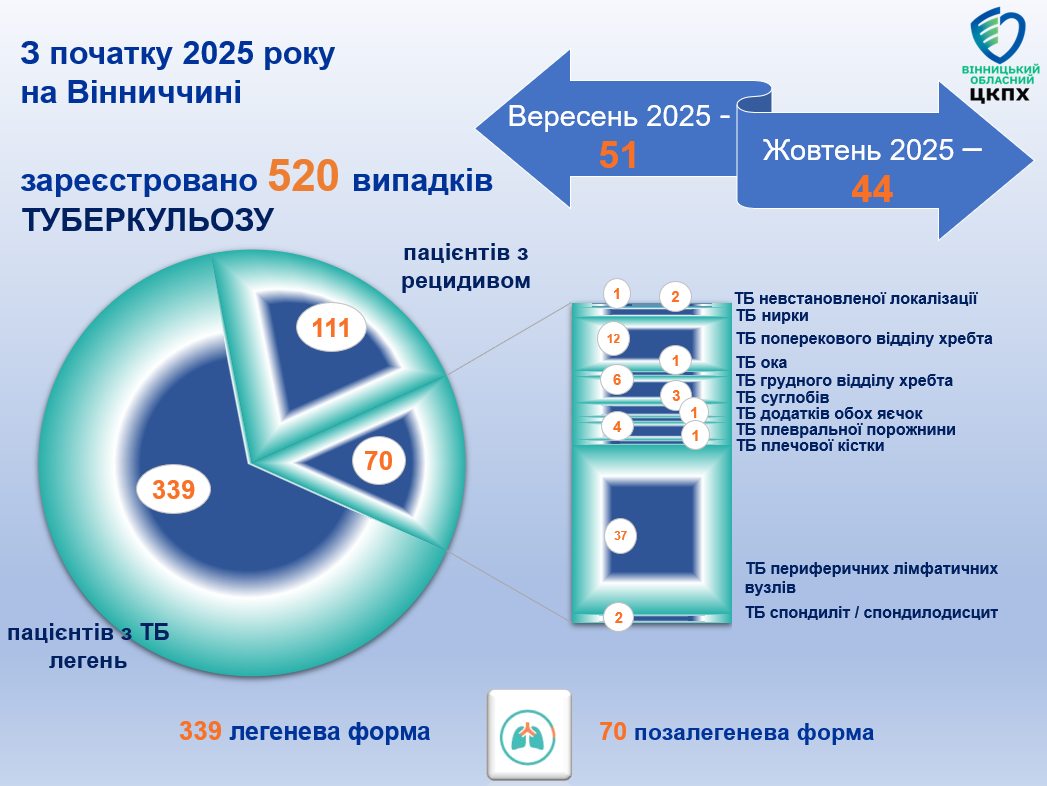 З початку 2025 року на Вінниччині зареєстровано 520 випадків туберкульозу. Із них 339 припадає на туберкульоз легень, 111 становлять рецидиви захворювання.