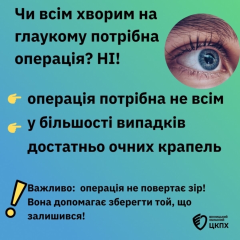 Багато хто боїться хірургічного втручання, але воно й не всім хворим на глаукому рекомендоване. Важливо знати: операція не повертає втрачений зір, але вона рятує той, що залишився. Це надійний спосіб знизити тиск, коли краплі вже не допомагають. Але якщо краплі діють добре й тримають тиск у нормі, операцію зазвичай не рекомендують. Тому лікар підбирає краплі індивідуально кожному пацієнтові.