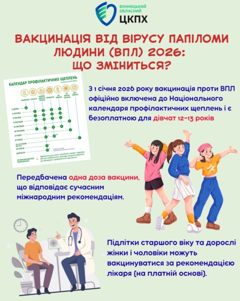 3 січня 2026Фахівці відділу імунопрофілактики Вінницького обласного центру контролю та профілактики хвороб пояснюють, що змінюється у щеплення від вірусу папіломи людини після введення в дію оновленого Національного календаря профілактичних щеплень.