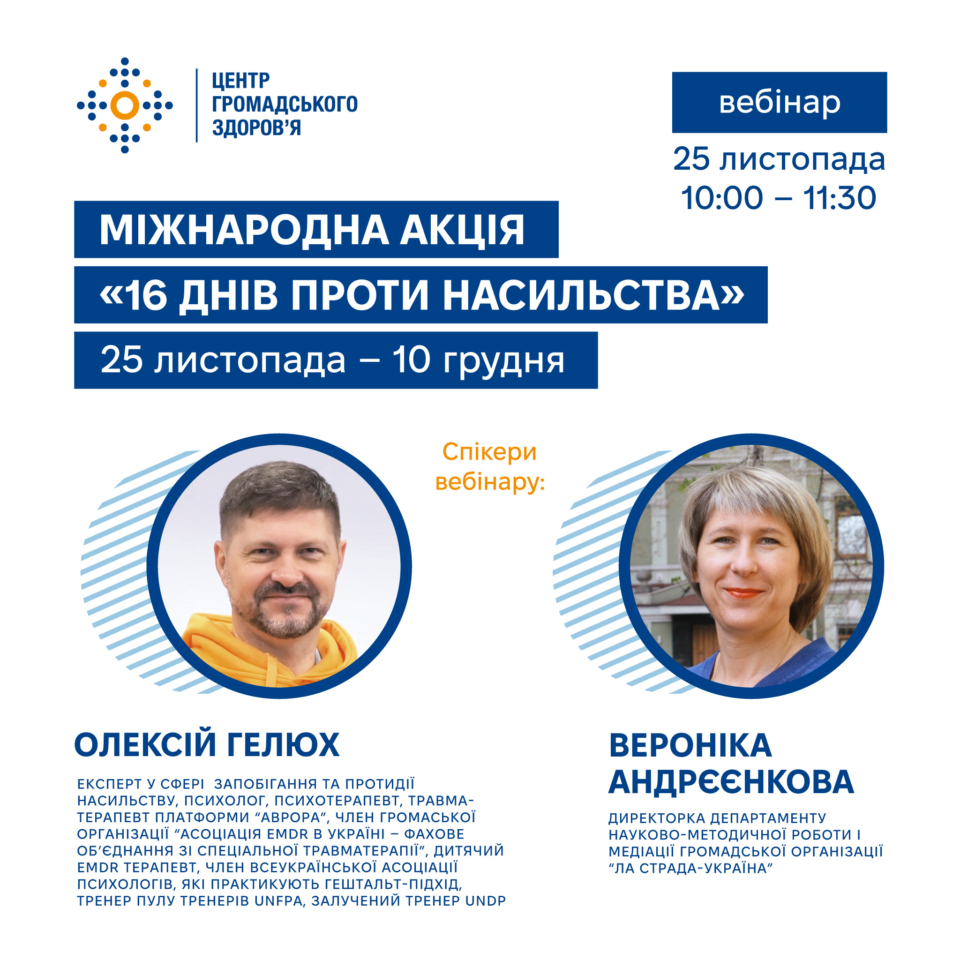 Центр громадського здоров’я запрошує працівників центрів контролю та профілактики хвороб (ЦКПХ), відповідальних за психічне здоровʼя, та всіх охочих взяти участь у вебінарі до початку міжнародної акції «16 днів проти насильства».