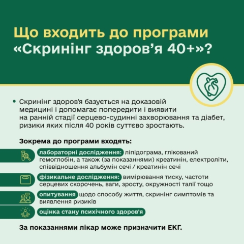 «Скринінг здоров’я 40+» — це програма раннього виявлення серцево-судинних захворювань, цукрового діабету та розладів психічного здоров’я, яка стартувала в Україні на початку 2026 року.