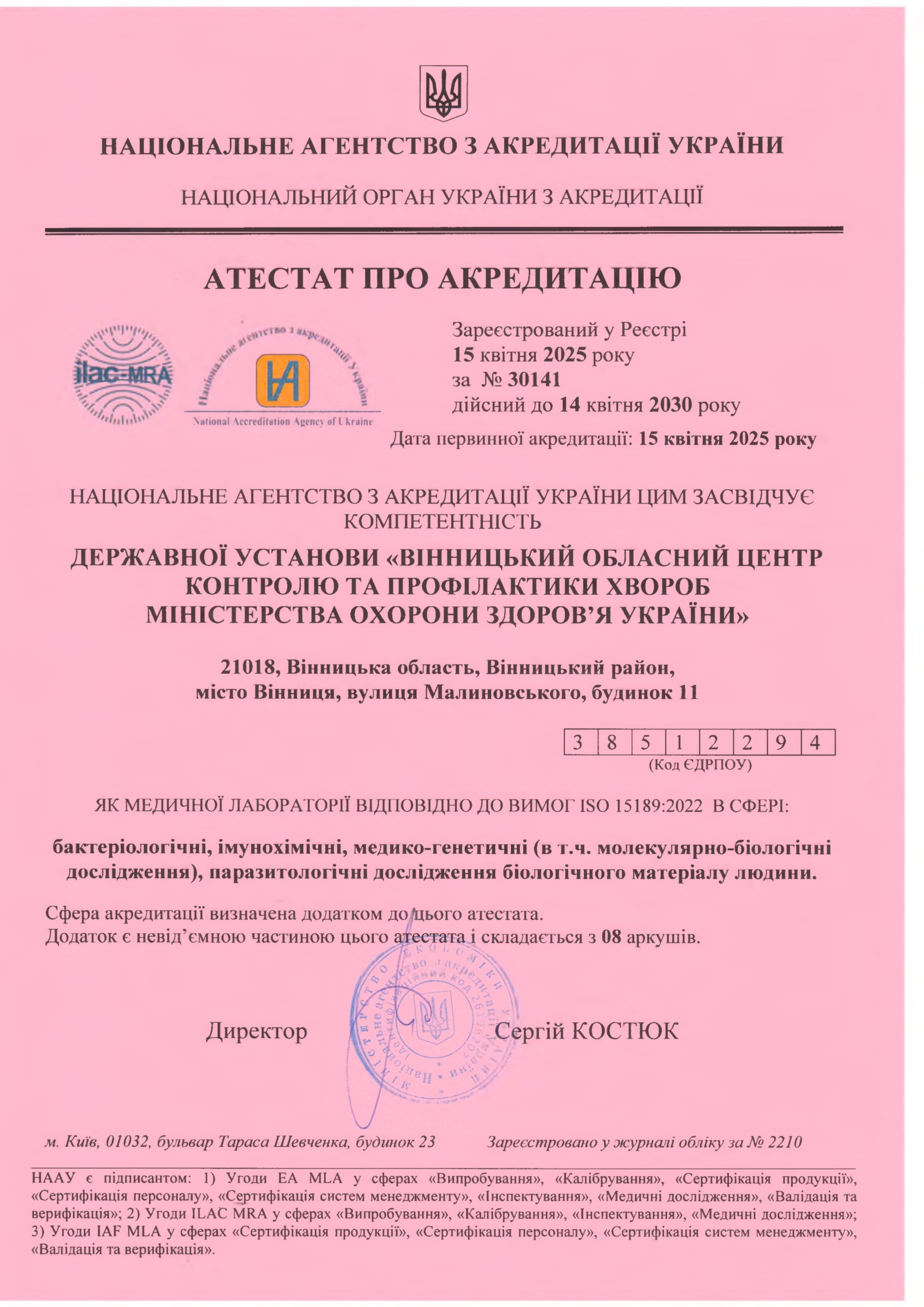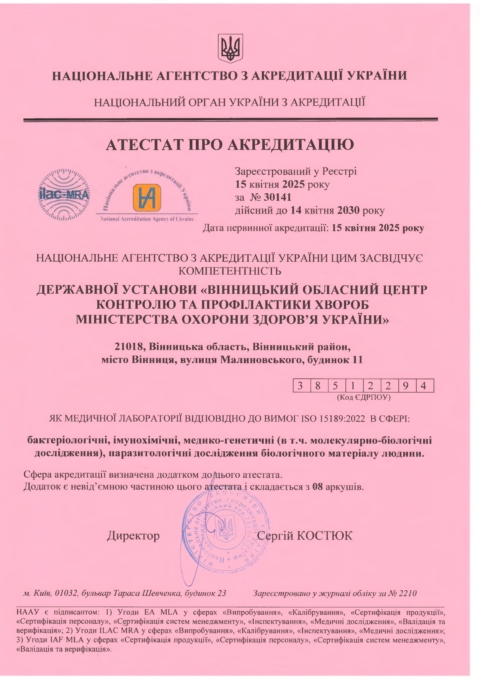 21 квітня 2025Вінницький обласний центр контролю та профілактики хвороб отримав атестат про акредитацію, який засвідчив компетентність установи як медичної лабораторії відповідно до вимог ISO 15189:2022.
