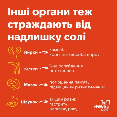 Надмірна кількість солі в раціоні шкодить не лише серцю, а й негативно впливає на кістки, шлунок і навіть пам’ять. Але саме серцево-судинна система найбільше страждає від постійного «пересолу». Докладніше у слайдах, гортай