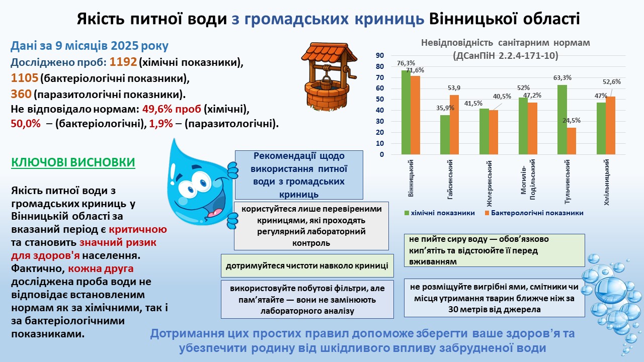 Більш докладні показники, а також рекомендації щодо споживання криничної води – в інфографіці відділу безпеки середовища життєдіяльності Вінницького ОЦКПХ.