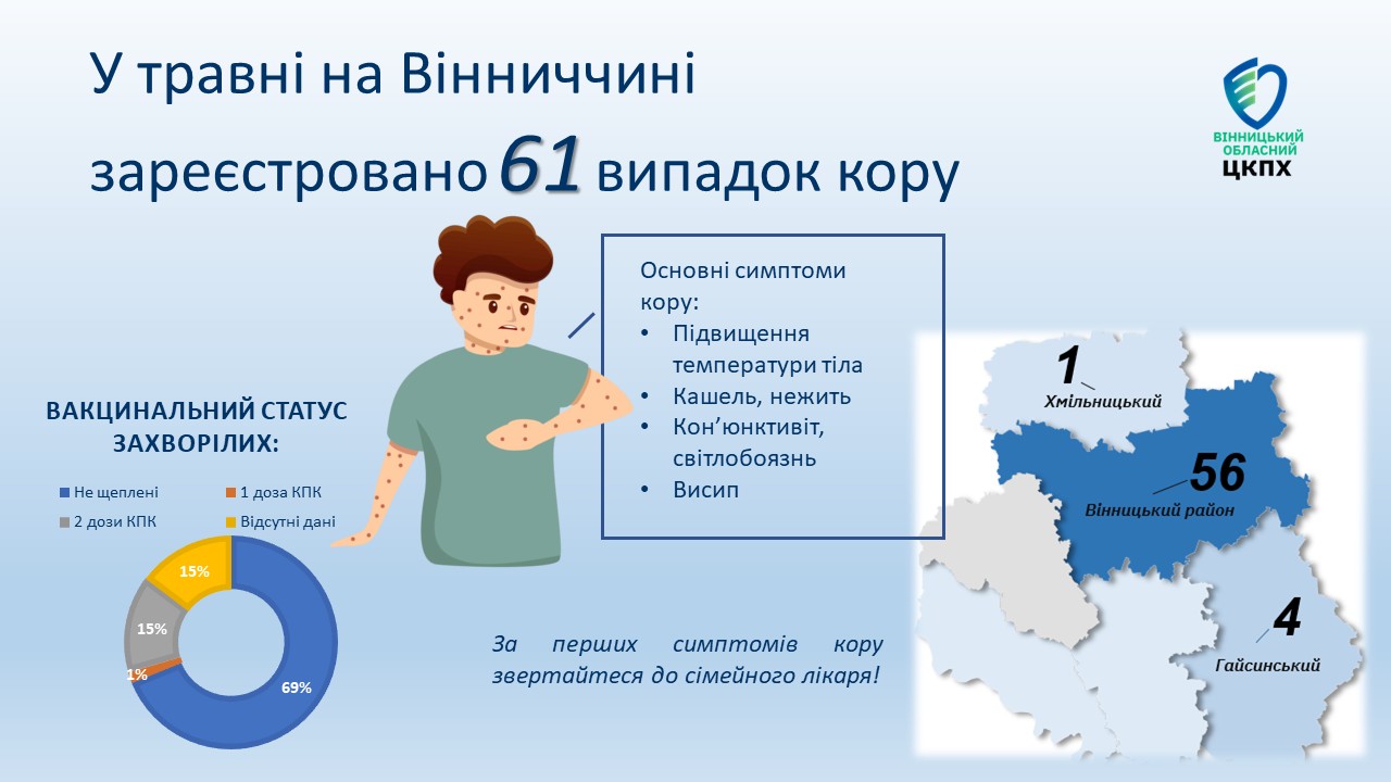 У травні 2025 року на території області зареєстровано 61 випадок кору, серед яких 47 дітей і 14 дорослих. Переважна більшість захворілих зареєстрована у Вінницькому районі – 56 випадків (в т. ч. місто Вінниця – 50 випадків). Детальніше в інфографіці.