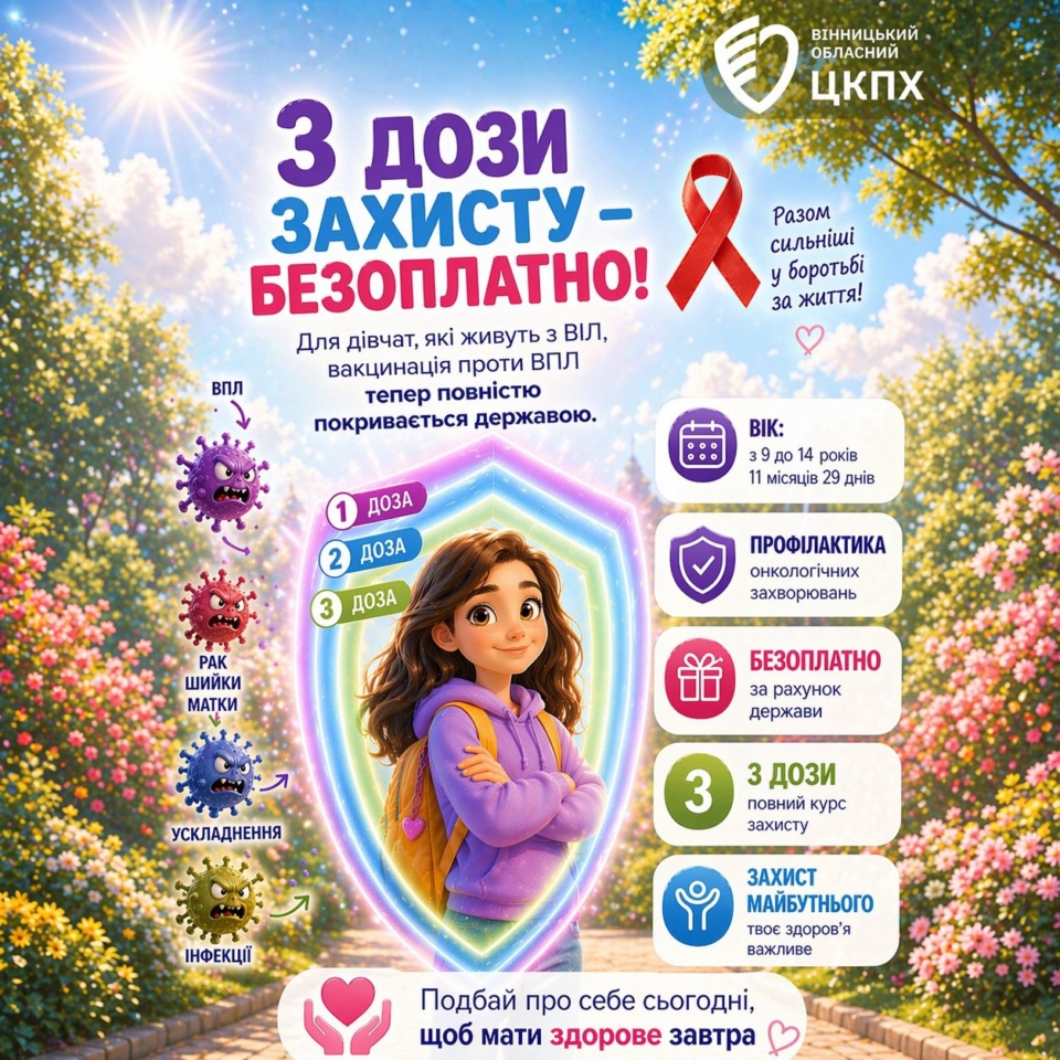 Сьогодні в Україні передбачена безоплатна трьохдозна вакцинація проти ВПЛ для дівчат, які живуть з ВІЛ – це можливість надійно захистити здоров’я в майбутньому.