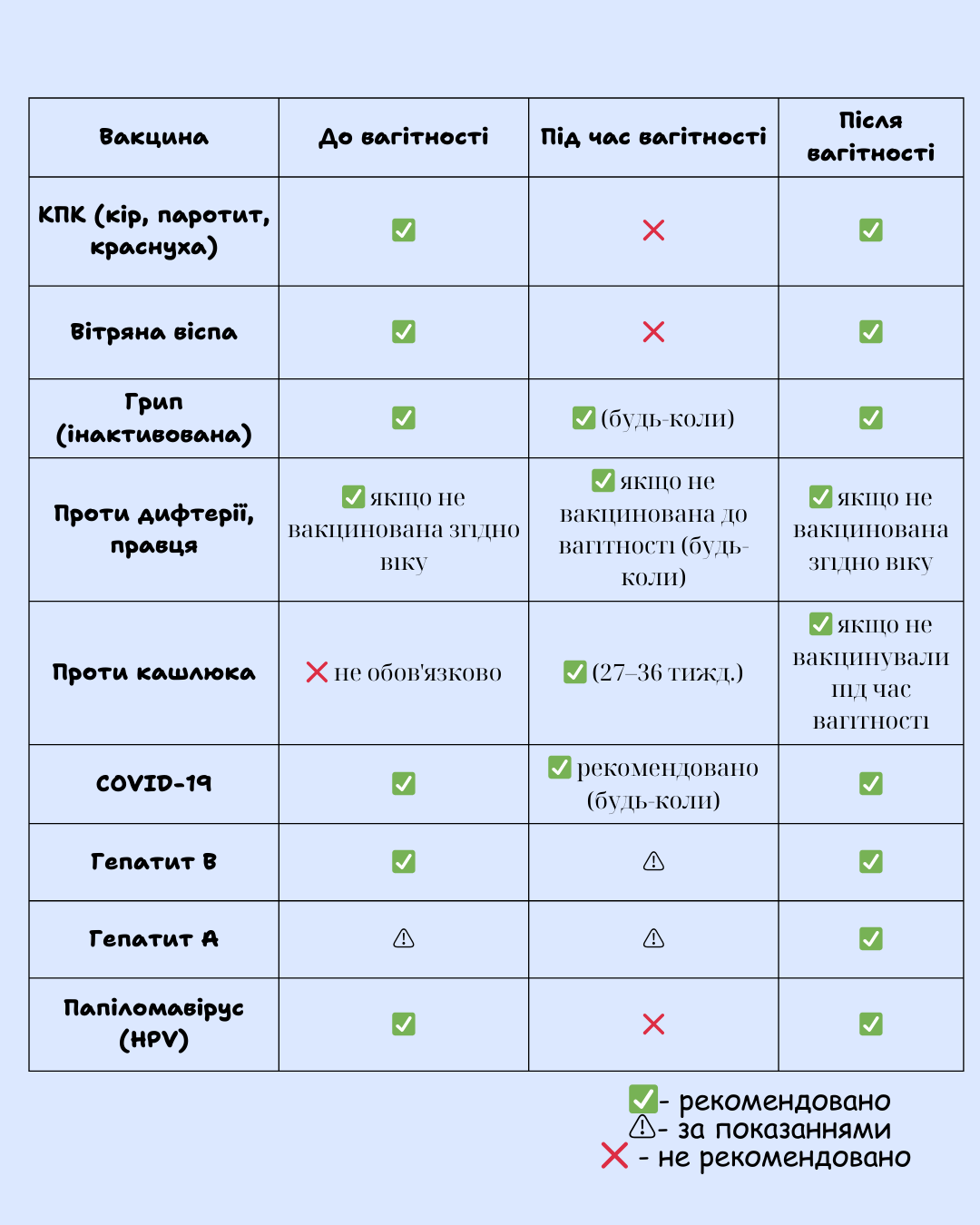 Завжди консультуйтеся з лікарем-гінекологом або сімейним лікарем щодо вакцинації під час вагітності.