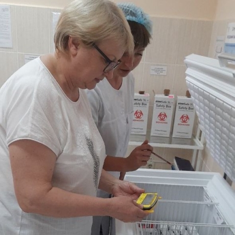 Лікар Людмила Зубко вивчала первинну облікову документацію, аналізувала показники роботи, а також дотримання вимог холодового ланцюга та техніки безпечного поводження з ін’єкційними відходами в кабінеті щеплень.